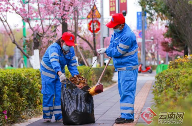 近日,竞相开放的冬樱花吸引了不少市民驻足观赏,因与滇池畔飞舞着红嘴鸥的海埂大坝垂直相连,盛开于昆明滇池国家旅游度假区红塔西路两旁的冬樱花,便成了赏樱的绝佳去处。在这里,市民可以一站式“打卡”昆明两大冬季美景,赏樱、观鸥两不误。然而,在美景之处却有一拨身着天蓝色保洁人员在忙碌,他们让赏樱观鸥大道一尘不染,为游客提供一个整洁干净的环境。这些保洁人员来自云南京环海洁公司,因为一身天蓝色服装市民称他们为“京环蓝”。