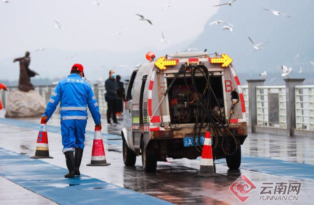 观鸥途中“铲屎官”相随赏完冬樱花,大部分游客会来海埂大坝上看看昆明人的老朋友——红嘴鸥。小精灵们自由自在翱翔,但鸥粪的跌落总让人不爽,游客一不小心就会“中招”,衣服或头上常被鸥粪“光顾”,而环卫工人们清理起来更是困难,传统的人工清理费时费力。云南京环海洁公司结合实际情况,针对特殊污染物的处理,研究出了利用具有高压冲水功能的步道车清理鸥粪的方法。