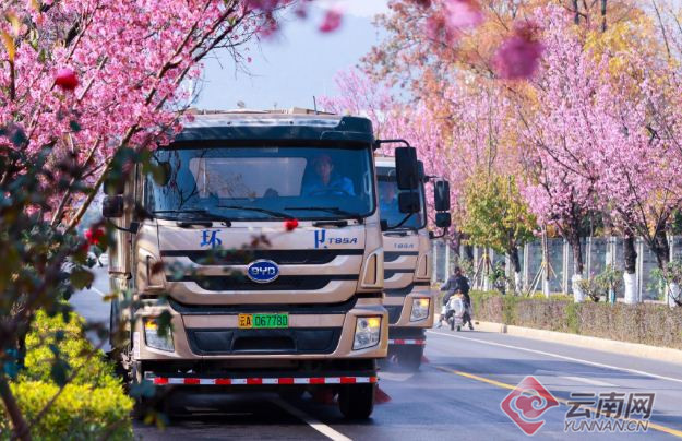 赏樱路上洗扫车相伴为给市民提供一个整洁的赏樱、观鸥环境,云南京环海洁公司加大保洁力度,调派了两辆纯电动零排放洗扫车,用以清除路面灰尘。这洗扫车可谓“大有来头”,它是新能源环卫汽车的代表,具有零排放、零污染、低噪音、低热辐射的特点,有效降低了车辆尾气排放对环境造成的污染,每年每辆车可减少80 吨二氧化碳排放量。“大家来赏樱,看着路上威风的洗扫车,也不失为一种风景嘛!大家也不用担心吸入尾气,可以尽情地闻着花香啦!”驾驶员李忠福自豪地说道。