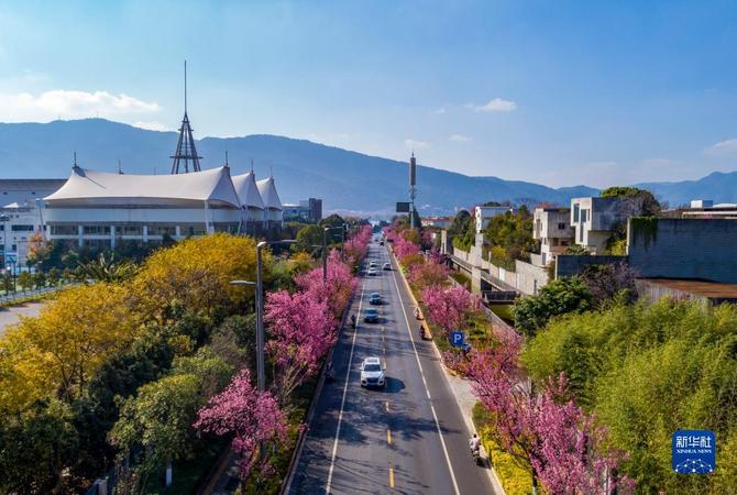 12月21日,云南省昆明市阳光明媚。在昆明市一些路段,道路旁种植的冬樱花在蓝天下绽放,美景如画。