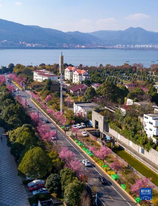 昆明市红塔西路绽放的冬樱花(无人机照片)。