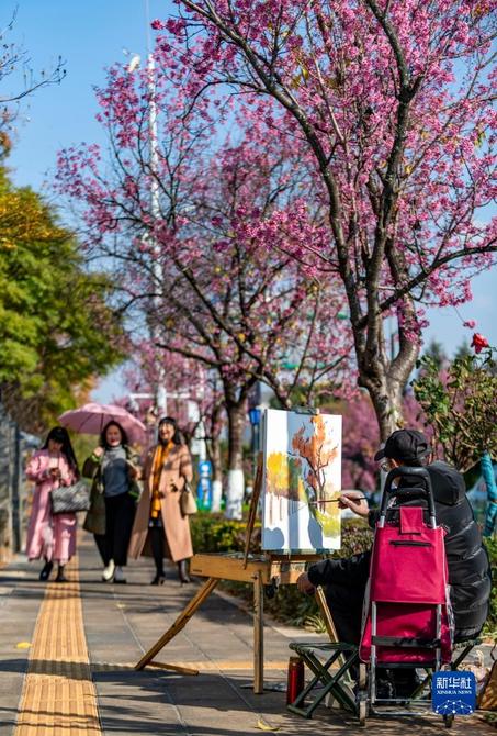 一名游客在昆明市红塔西路绽放的冬樱花下写生。