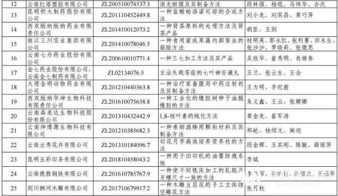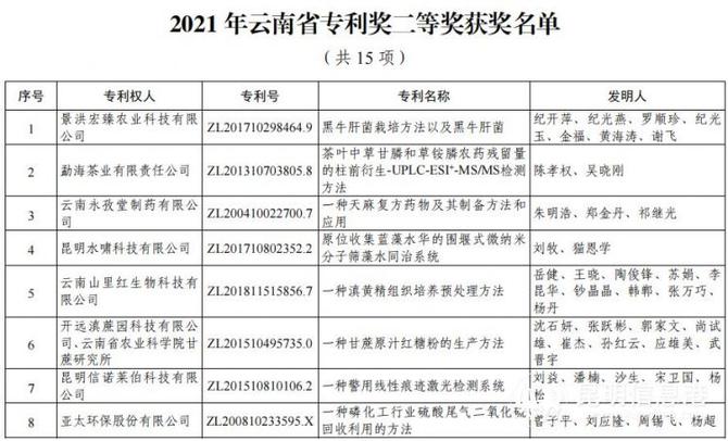 据悉,云南沃森生物技术股份有限公司“一种13价肺炎球菌多糖—蛋白结合物组合物及其制备方法和应用”等10项发明专利获一等奖;景洪宏臻农业科技有限公司“黑牛肝菌栽培方法以及黑牛肝菌”等15项发明专利获二等奖;昆明全波红外科技有限公司“一种可镀DLC膜的光学无热化长波红外镜头”等25项发明专利获三等奖。