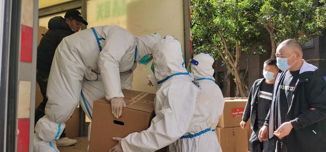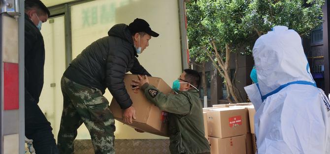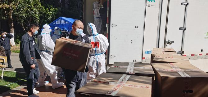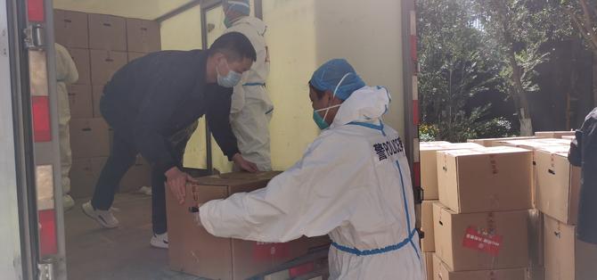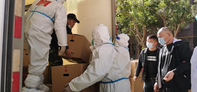 “一栋卸120箱生活物资……”12月29日14:00,一辆辆疫情防控保障物资车辆正在管控区的蓝光天娇城一期、三期内卸货中,防疫工作人员和小区志愿者正有序进行搬运、登记、配送。