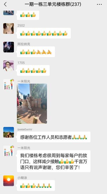 生活物资及时到位,隔离居民生活有保障,为保障好生活物资配送,减少交叉感染风险。小区内约有一百余名的志愿者主动报名投入到小区管理和居民服务中,积极为居民群众提供便捷服务,保障每家每户第一时间收到这份“暖心物资”。