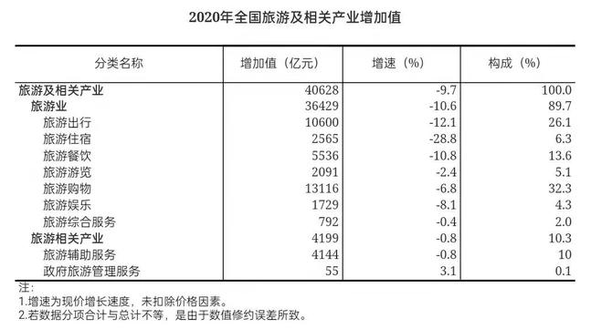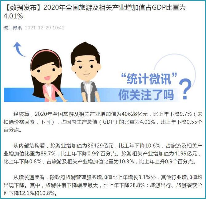 据统计微讯微信公众号消息,经核算,2020年全国旅游及相关产业增加值为40628亿元,比上年下降9.7%(未扣除价格因素,下同),占国内生产总值(GDP)的比重为4.01%,比上年下降0.55个百分点。