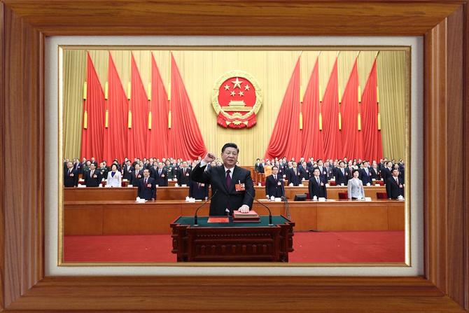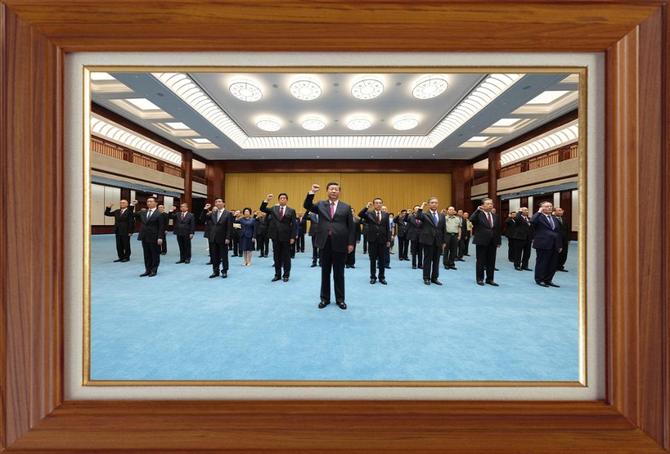 这一张工作照,是习近平连任国家主席后,向宪法宣誓。自发表2019年新年贺词起,就一直摆在书架上。