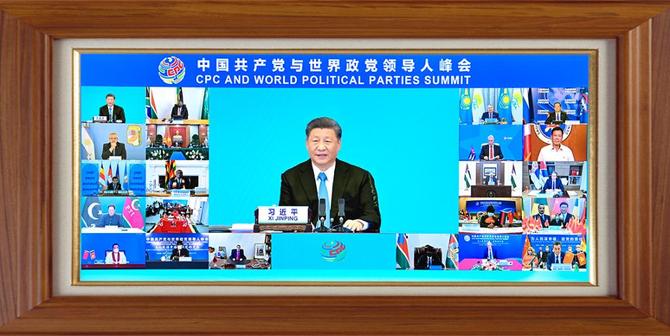 7月6日晚,中国共产党与世界政党领导人峰会在北京人民大会堂以视频连线方式举行。长34米、高6米的巨型组合屏幕上,习近平总书记同160多个国家的500多个政党和政治组织的领导人“同框”。
