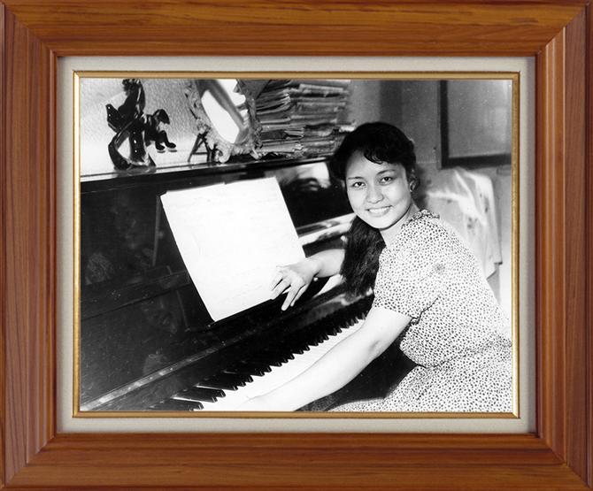 一张是彭丽媛年轻时坐在钢琴前的单人照。