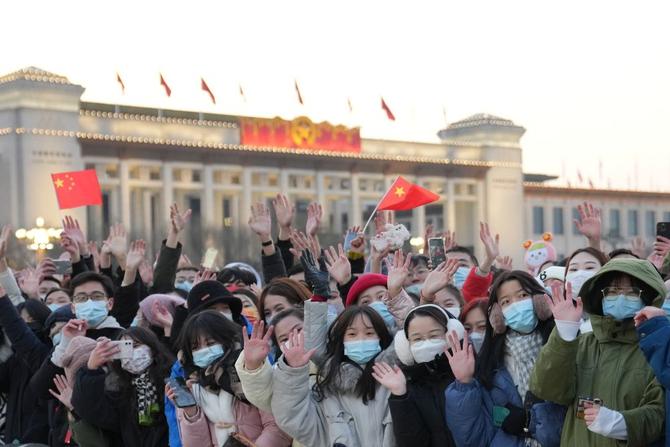 2022年1月1日晨,北京天安门广场举行隆重的升国旗仪式。这是观众在升旗仪式结束后欢呼。(新华社记者鞠焕宗摄)
