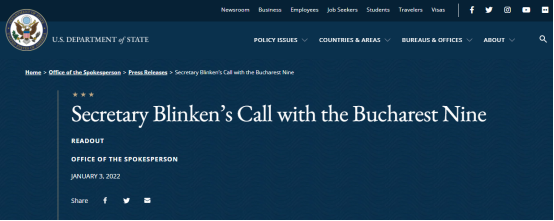 据美国国务院官网1月3日一份最新声明,美国国务卿布林肯当天与“布加勒斯特9国”外长、副外长通话,话题涉及俄乌局势问题,以及近来频繁挑衅中国的立陶宛。