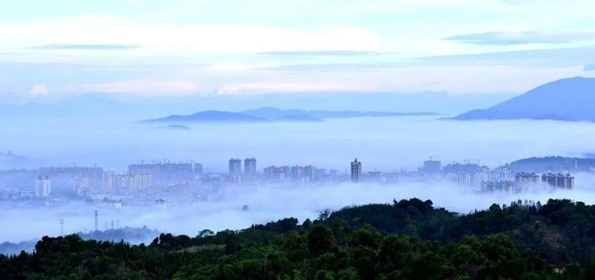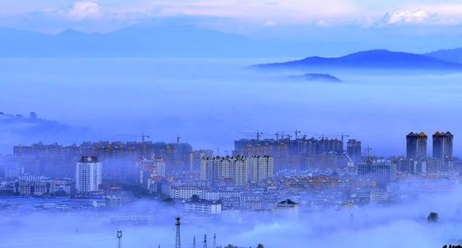 站在高处向下俯瞰,犹如仙境一般,令人心旷神怡。森林就像一道屏障,牢牢将雾气围在城中,为它盖上了一层“薄被”。清晨的朝阳随时而升,冲破层层雾气,照向这座快速发展的城市。(新华社 记者佐连江)