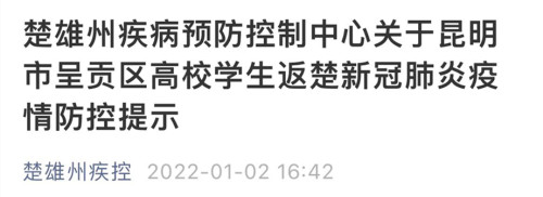 2021年12月24日,昆明市呈贡区雨花街道营盘社区蓝光天娇城小区出现4例本土病例,12月25日,呈贡区雨花街道营盘社区蓝光天娇城小区调整为中风险地区。近期呈贡区大学城高校将陆续放假,楚雄州户籍学生将陆续返楚,为针对性做好楚雄州新冠肺炎疫情防控工作,根据楚雄州新冠肺炎疫情防控指挥部《关于进一步做好2022年元旦和春节期间疫情防控工作的通告》、《关于做好春节返乡大学生疫情防控工作的通知》要求,现提示如下:
