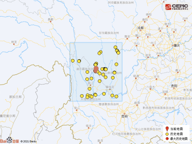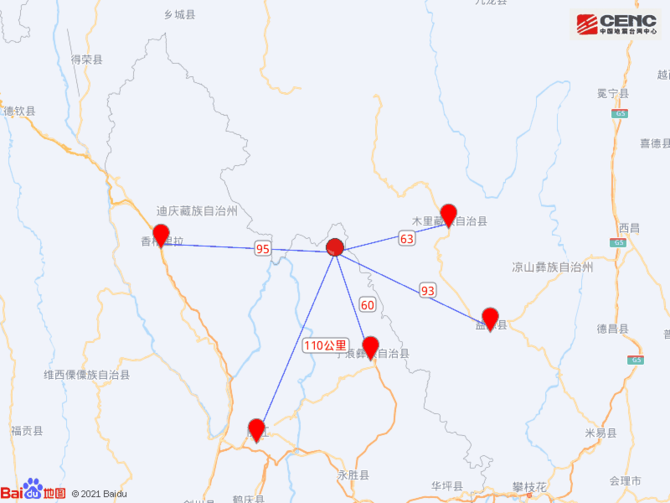 周边县城:震中距宁蒗彝族自治县60公里、距四川木里藏族自治县63公里、距香格里拉市90公里、距四川盐源县93公里、距古城区110公里,距迪庆藏族自治州94公里,距昆明市368公里。