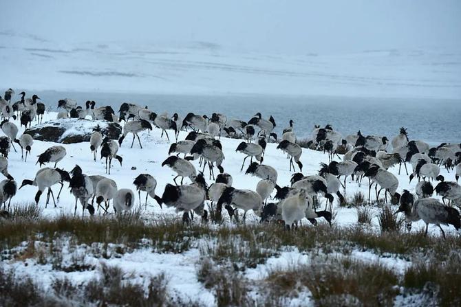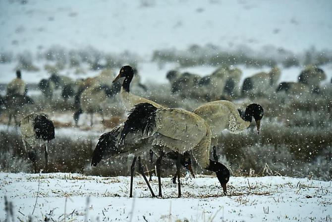 日前,昭通大山包黑颈鹤国家级自然保护区骤降大雪,1700余只黑颈鹤雪中忙碌地觅食。