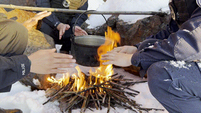 巡逻途中,他们就地取材,找到三块石头围成三角形状作为“灶台”,将小锅放在上面,锅内装满雪,用融化后的雪水煮汤做饭,最后再加上一把绿油油的青菜,也算得上是一顿“营养丰富”的午餐。