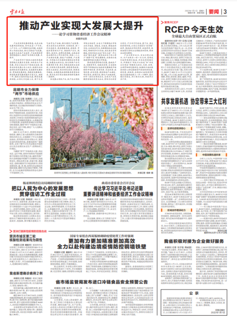 2022年1月1日凌晨,《区域全面经济伙伴关系协定》(RCEP)生效实施,全球最大自由贸易区正式启航。随着RCEP生效、中国东盟全面战略伙伴关系建立、中老铁路等国际大通道加快打通,云南“东引西联”的独特区位优势更加凸显。省委经济工作会议指出,我们要统筹发展和安全,在坚决守好边境的同时,推进对外开放迈出新步伐、实现新突破。