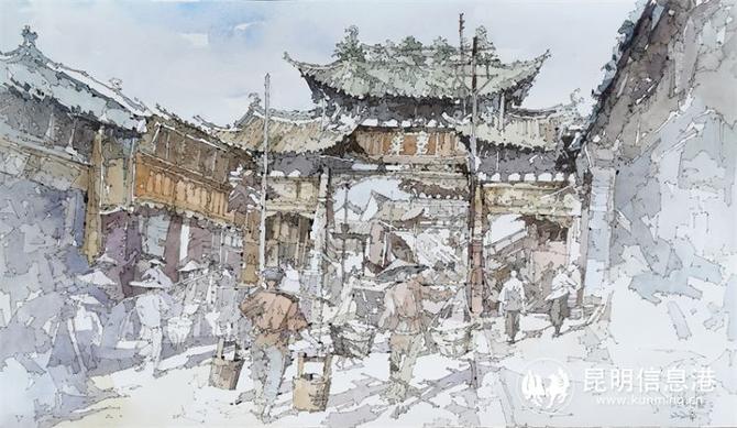 年复一年,在蒋凌的画笔下,昆明的老街、老巷、老屋、老树成了他捕捉记忆的载体,青云街、天君殿巷、凤翥街、柿花桥、地台寺……记忆中的老昆明跃然纸上。
