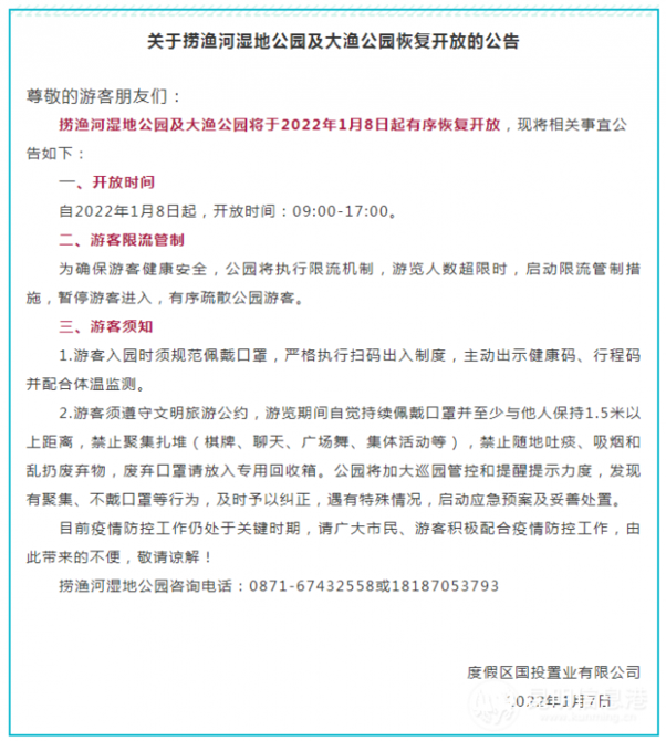 昆明信息港讯 记者杨雁 从度假区国投置业有限公司传出消息:2022年1月8日起,捞渔河湿地公园及大渔公园将有序恢复开放,请入园游客严格遵守疫情防控要求。