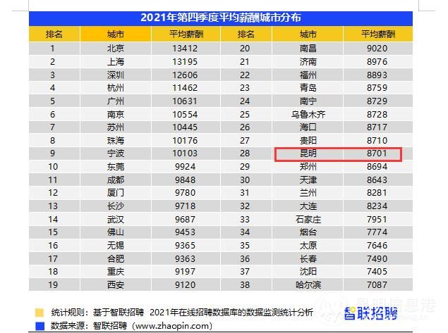 智联招聘近日发布2021年第四季度《中国企业招聘薪酬报告》,其中指出,该季度全国38个核心城市平均招聘月薪首次破万,达到10111元,环比上涨3.8%,较去年同期的8923元高出13.3%。昆明以8701元的招聘薪酬,位列全国38个核心城市的第28位。