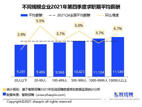 行业方面,2021年四季度信托/担保/拍卖/典当行业超过基金/证券/期贷/投资行业,以12826元/月的薪资重回榜首,能源/矿产/采掘/冶炼(12081元/月)环比上涨12.8%,跃居第4位。疫情促进了线上信息技术服务等外包服务需求增长,该行业本季度薪资涨幅达13.3%。教培业受“双减”政策影响,整体招聘需求减少,薪资也有所下降,四季度薪酬环比下降1%;旅游业也受到疫情反扑影响,薪酬下降1.5%。
