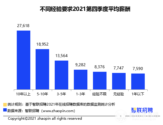 博士的平均招聘薪酬最高,为26587元/月;硕士位于第2位,为17302元;本科的平均招聘薪酬为13670元;大专学历的岗位平均招聘薪资为9464元/月;初中及以下的岗位薪资为6979元/月。要求10年以上工作经验的岗位,平均薪酬高达27618元/月,要求1年以下经验的岗位,平均月薪为7590元。(昆明信息港 记者江枫)