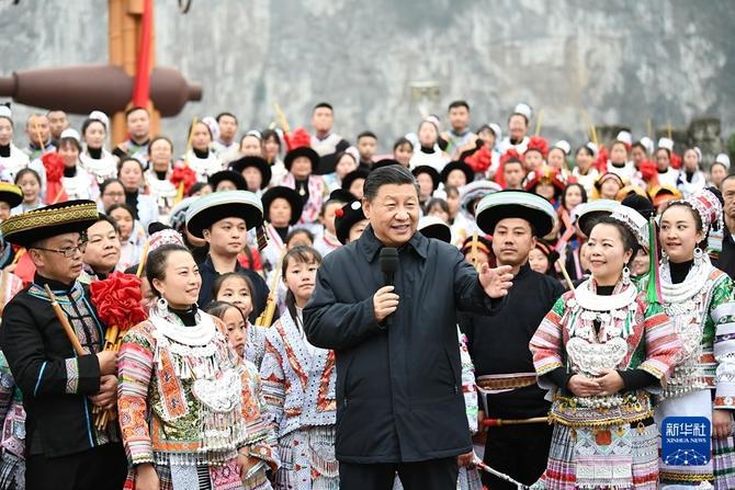 2021年2月3日至5日,中共中央总书记、国家主席、中央军委主席习近平来到贵州考察调研,看望慰问各族干部群众,向全国各族人民致以美好的新春祝福。这是3日下午,习近平在毕节市黔西县新仁苗族乡化屋村文化广场上,向全国各族人民、港澳台同胞和海外侨胞拜年。