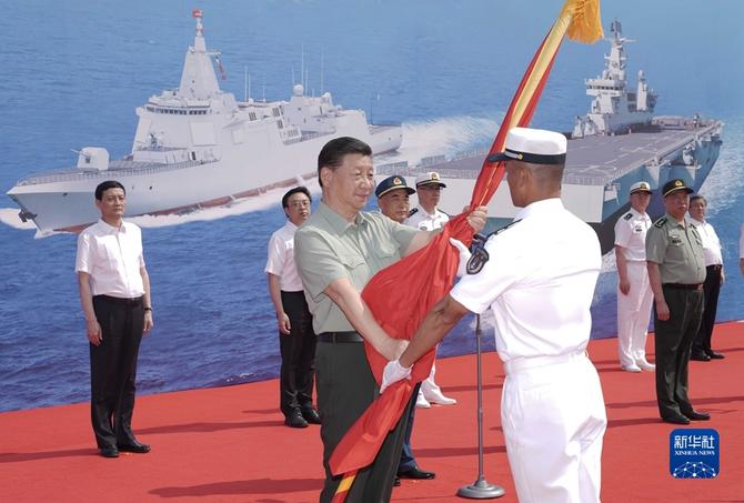 2021年4月23日,海军三型主战舰艇——长征18号艇、大连舰、海南舰在海南三亚某军港集中交接入列。中共中央总书记、国家主席、中央军委主席习近平出席交接入列活动并登上舰艇视察。这是习近平向长征18号艇授予军旗、命名证书。
