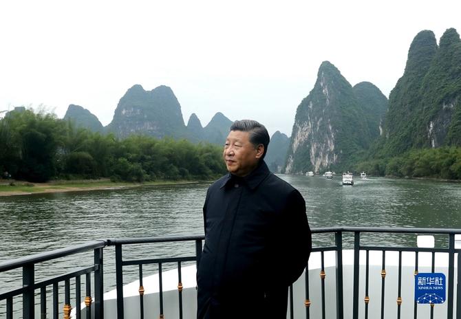 2021年4月25日至27日,中共中央总书记、国家主席、中央军委主席习近平在广西考察。这是25日下午,习近平在桂林市阳朔县,乘船考察漓江阳朔段。