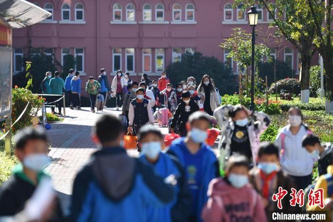 图为在学校封闭管理的学生走出学校 刘冉阳 摄