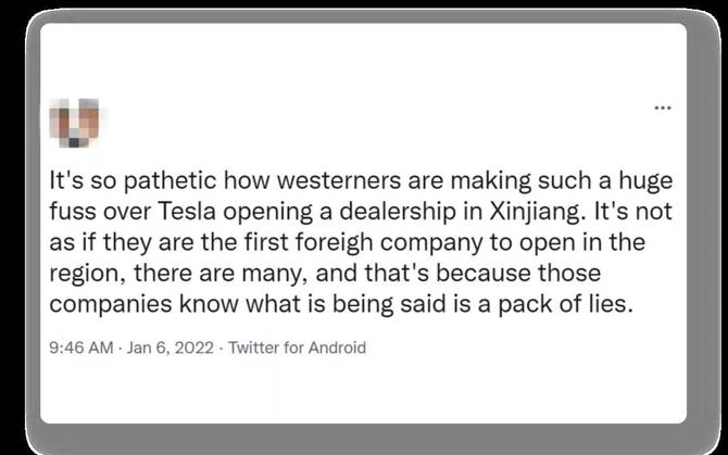 ▲西方人对特斯拉在新疆开设门店一事大惊小怪,这太可悲了。特斯拉并不是第一个在该地区开业的外国公司,那里的外企不少,因为他们知道西方(针对新疆)说的都是一派胡言。