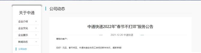 德邦快递于2021年12月14日率先宣布“春节不休”,称2022年春节期间将继续不打烊。