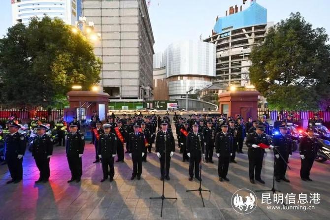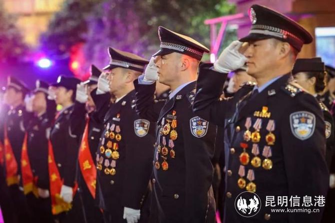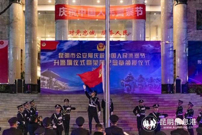 上午7时30分,昆明市公安局举行升警旗仪式,全体民警齐唱《中国人民警察警歌》。民警以誓词为号令,警旗为指引,面向中国人民警察警旗庄严宣誓。随后,昆明市公安局举行仪式,对立功受奖的集体和个人代表进行现场表彰并颁授奖状及奖章证书,为从警10年、20年、30年的民警辅警代表及近期光荣退休的民警辅警代表颁授纪念章。