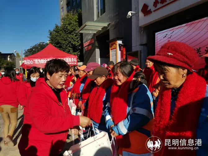 工作人员给社区老年人、环卫工人送上志愿者手织围巾、长寿面、鲜花饼,分发腊八粥,表彰最美志愿者、抗疫巾帼志愿者代表,慰问失独家庭、困难家庭,为他们送上了温暖的新春祝福。