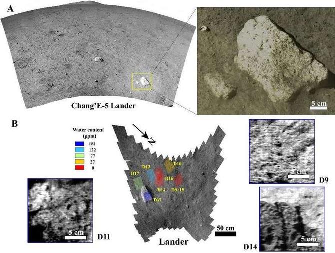 据了解,嫦娥五号光谱仪对采样区约2米×2米范围的区域进行了光谱观测,除了月壤之外还包括了一块没有带回来的岩石。探测发现岩石和月壤体现出不同程度的吸收。实验室的数据显示矿物中水的含量与其光谱吸收强度具有很好的线性关系,这个线性关系主要与粒径相关。根据目前已有月壤样品的测量,它们的平均粒径约60~80微米,据此估算嫦娥五号采样区的水含量在120ppm以下;而岩石中的水含量约为180ppm。相当于1吨月壤中大约有120克水,1吨岩石中大约有180克水。