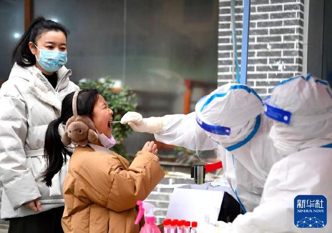 1月10日,在郑州市二七区政通路一处核酸检测点,医务人员为小朋友进行核酸检测取样。