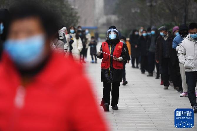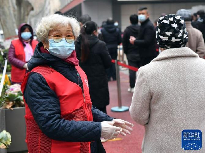 1月7日,在郑州市经八路办事处一处检测点,75岁的志愿者耿小娣(左)在引导市民排队。