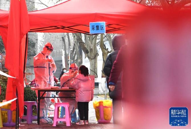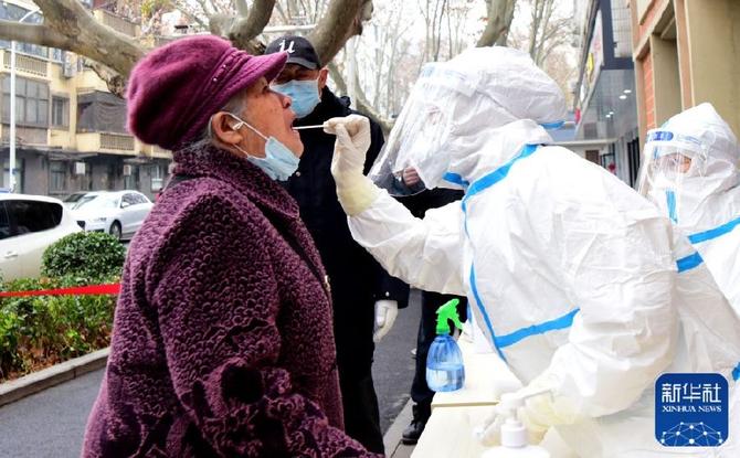 1月10日,在郑州市二七区政通路一处核酸检测点,医务人员为市民进行核酸检测取样。