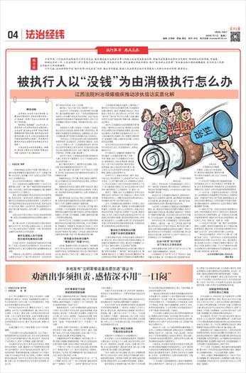 2021年以来,江西高院对消极执行、选择性执行、拖延执行以及超标的、超时限、超范围查封等问题进行专项治理,通过既查案又查人的“一案双查”机制,共查纠消极执行30件,整治超标的查封57件。