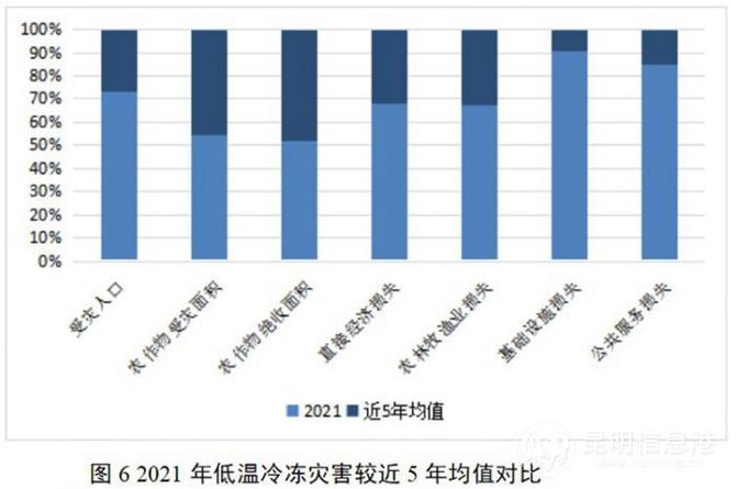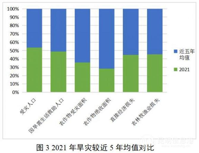 与近5年均值相比,受灾人口增加14.79%,因旱需生活救助人口下降5.03%、农作物受灾面积下降44.85%、农作物绝收面积下降60.8%、直接经济损失下降18.54%。全年大理、丽江、曲靖受旱灾影响较重,经济损失分别为3.15、3.15、3.07亿元,迪庆、昆明旱情较轻,经济损失分别为1191、1202万元。