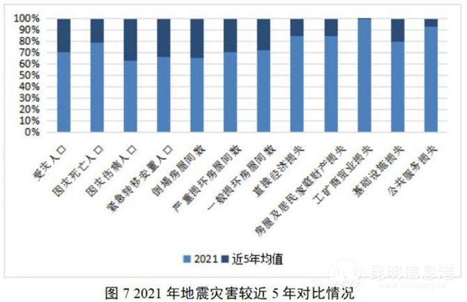 2021年,因地震灾害共造成玉溪、保山、昭通、普洱、临沧、楚雄、大理、德宏10个州市23个县市区19.61万人次不同程度受灾,因灾死亡3人,紧急避险转移12940人次,紧急转移安置31163人次,需紧急生活救助32676人次;房屋倒塌1856间,严重损坏19103间,一般损坏81082间;直接经济损失34.15亿元。