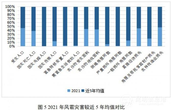 与近5年均值相比,受灾人口增加143.38%、因灾死亡人口增加33.33%、需紧急生活救助人口增加54.22%、农作物受灾面积增加47.42%,紧急转移安置人口减少58.87%、农作物绝收面积减少24.77%、房屋倒塌减少55.02%、房屋严重损坏减少68.44%、房屋一般损坏减少16.05%、直接经济损失减少16.14%。