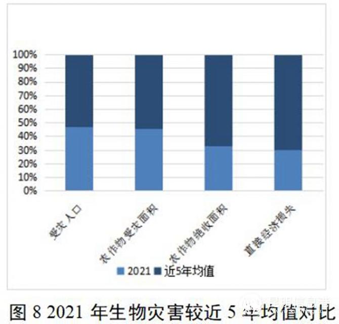 2021年因生物灾害共造成临沧、红河、文山、版纳、大理5个州市12个县市区18.51万人次不同程度受灾;农作物受灾面积18.28千公顷,绝收面积0.3千公顷;直接经济损失2466.36万元。