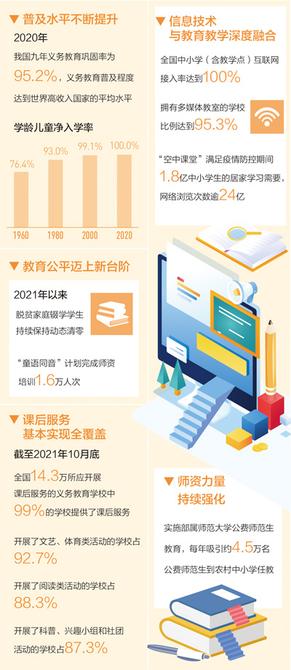 党的十八大以来,在以习近平同志为核心的党中央坚强领导下,我国义务教育取得了举世瞩目的成就:2020年,我国九年义务教育巩固率为95.2%,义务教育普及程度达到世界高收入国家的平均水平;实施义务教育薄弱环节改善和能力提升项目,发展“互联网+”教育助力城乡教育均衡,全国义务教育基本均衡已经全面实现……让适龄儿童少年有学上、上好学,让每个孩子都能享有公平而有质量的教育,正在成为现实。