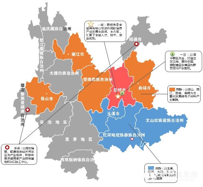 云南省信息产业“一核、一区、两群、多点”布局示意图(图片来源:云南省工业和信息化厅)