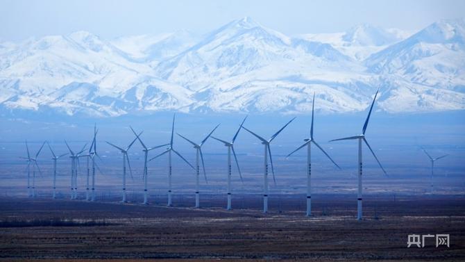 雪山下的风力发电机组(央广网记者 张海东 摄)