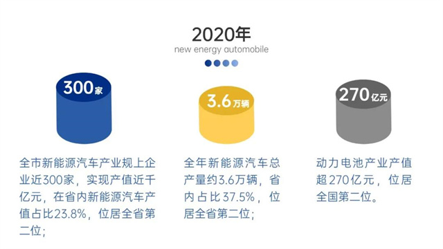 数据显示,2020年,常州市新能源汽车产业规上企业近300家,实现产值近千亿元,在省内新能源汽车产值占比23.8%,居全省第2位;新能源汽车总产量约3.6万辆,省内占比37.5%,居全省第2位;动力电池产业产值超270亿元,居全国第2位。
