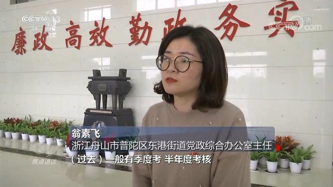 浙江舟山市普陀区东港街道党政综合办公室主任翁素飞说:“过去一般有季度考、半年度考核、全年度考核,二三十次总有的。考核季到来的时候,要花半个月或者一个月的时间,专门去应付考核工作。现在优化了之后,区里面统一组织年度综合考评,这样就一次考核,把所有的工作都考核掉。”