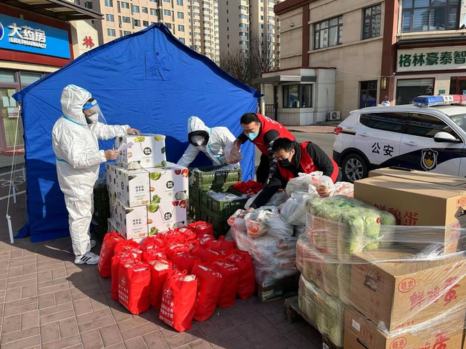 1月10日,在天津市津南区辛庄镇林锦花园附近,物美超市工作人员为居民运送生活物资。新华社 发