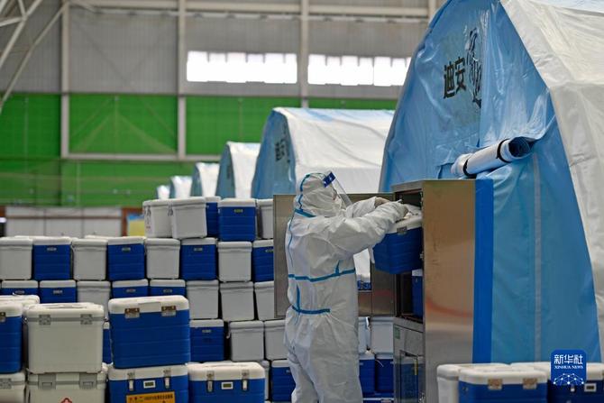 1月13日,工作人员向滨海新区汉沽网球馆内的气膜实验室运送新冠病毒核酸检测样本。新华社记者赵子硕摄